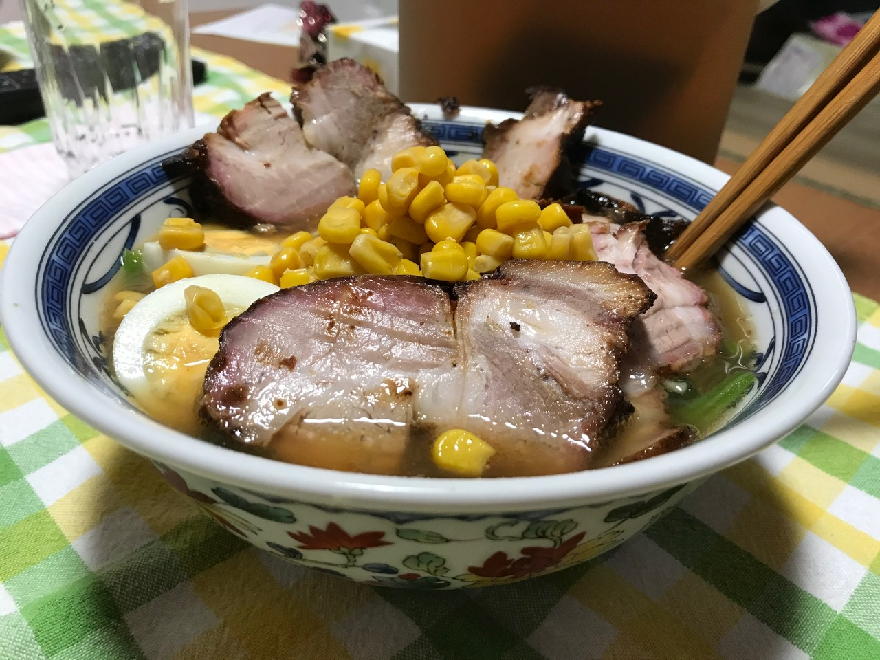 ちょうどラーメンもあったのでチャーシュー味噌味玉コーンほうれん草ラーメンの完成です。(自分で作りました)